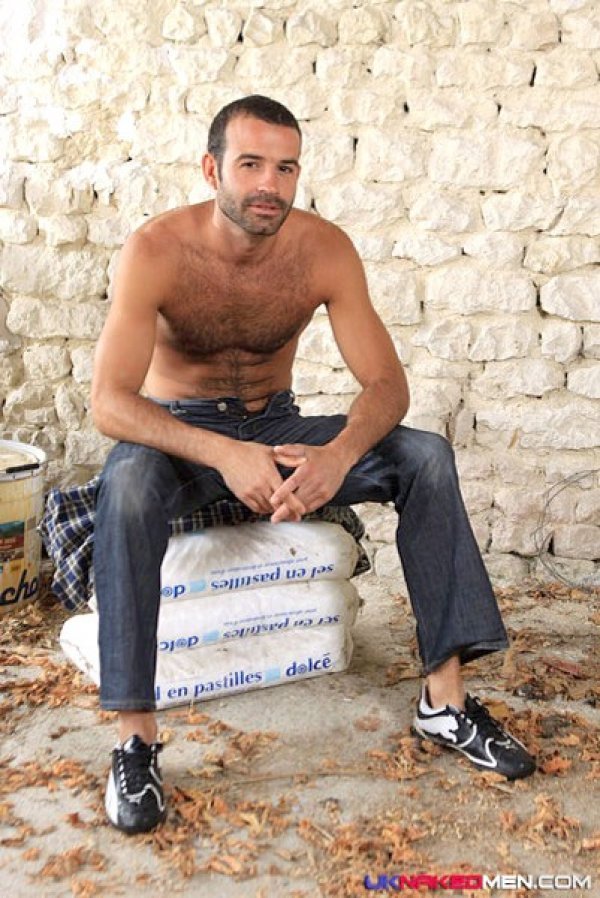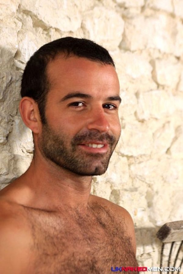 Safado do peito peludo mostrando as bolas e o pau com piercing